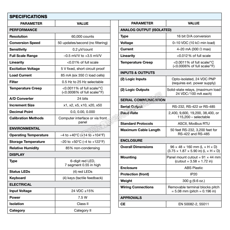 二、PS-1050稱重儀表產(chǎn)品參數(shù)