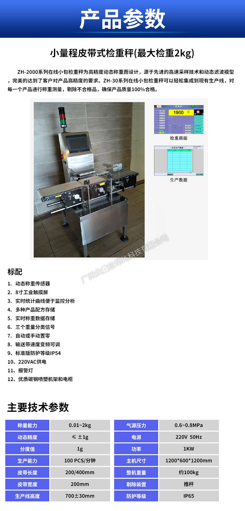 ZH-2000系列在線小包檢重秤為高精度動態(tài)稱重而設計,源于先進的高速采樣技術和動態(tài)濾波模型 ,完美的達到了客戶對產品高精度的要求。ZH-30系列在線小包檢重秤可以輕松集成到現(xiàn)有生產線,對 每一個產品進行稱重測量,剔除不合格品,確保產品質量100%合格。